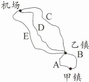10. 如图,从甲镇到乙镇有乡村公路 A 和省级公路 B 两条路线;从乙镇到机场有省级公路 C、高速公路 D 和城市高架 E 三条路线。李华驾车从甲镇到机场接人(不考虑其他因素)。