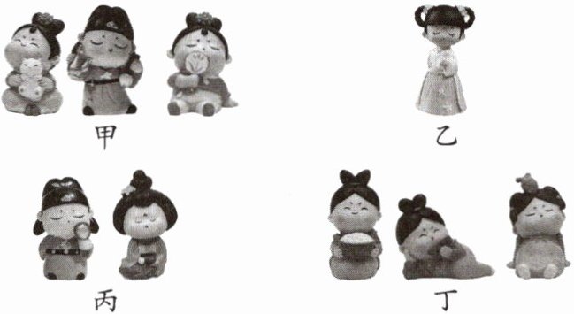 2. 小明和家人去西安旅游购买了甲、乙、丙、丁四个系列摆件,如图,甲系列有 3 个摆件,乙系列有 1 个摆件,丙系列有 2 个摆件,丁系列有 3 个摆件,每个系列各带有一个礼品盒(摆件均装入对应的礼品盒内),这四个礼品盒的外观和质量都相同.小明先让妈妈从四个礼品盒中随机选择一个拿走,再让爸爸从剩下的三个中随机选择一个拿走.