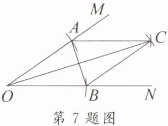 7. 新考向 尺规作图 如图,在 $\angle MON$ 的两边分别截取 $OA$,$OB$,使 $OA = OB$;分别以点 $A$,$B$ 为圆心,以 $OA$ 的长为半径作弧,两弧交于点 $C$,连接 $AC$,$BC$,$AB$,$OC$,则下列结论不一定成立的是(