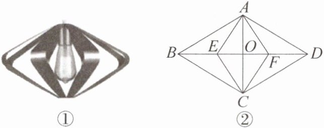 9. 新考向 情境题·吊灯 [2025·遵义期末节选]小颖家新房买了一盏简单而精致的吊灯(如图①),其正面的示意图大致如图②所示。四边形 $ABCD$ 是一个菱形外框架,对角线 $AC$,$BD$ 相交于点 $O$,四边形 $AECF$ 是其内部框架,点 $E$,$F$ 在 $BD$ 上,且 $BE = DF$。求证:四边形 $AECF$ 是菱形。