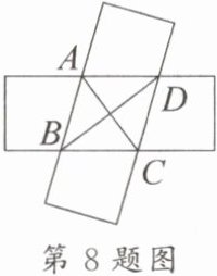 8. [教材 P8“做一做”变式题]如图,两张等宽且对边平行的纸条交叉重叠在一起,重叠的部分为四边形 $ABCD$。若测得点 $A$,$C$ 之间的距离为 $6\mathrm{cm}$,点 $B$,$D$ 之间的距离为 $8\mathrm{cm}$,则线段 $AB$ 的长为