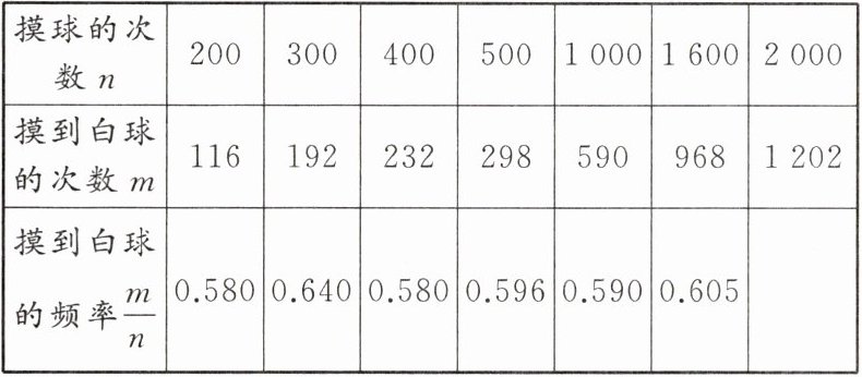 7. 某课外学习小组做摸球试验:一个不透明的袋子中装有若干个红球和白球,这些球除颜色外其他都相同。将袋中的球搅匀后从中任意摸出 1 个球,记下颜色后放回、搅匀,不断重复这个过程,得到如下数据: