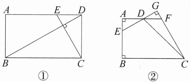 (2)如图②, 在四边形 $ ABCD $ 中, $ \angle A = \angle B = 90° $, $ E $ 为 $ AB $ 上一点, 连接 $ DE $, 过点 $ C $ 作 $ DE $ 的垂线交 $ ED $ 的延长线于点 $ G $, 交 $ AD $ 的延长线于点 $ F $, 求证: $ DE \cdot AB = CF \cdot AD $.