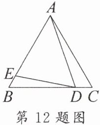 12. 如图, $ \triangle ABC $ 为等边三角形, 点 $ D $, $ E $ 分别在边 $ BC $, $ AB $ 上, $ \angle ADE = 60° $. 若 $ BD = 4CD $, $ DE = 2.4 $, 则 $ AD $ 的长为(