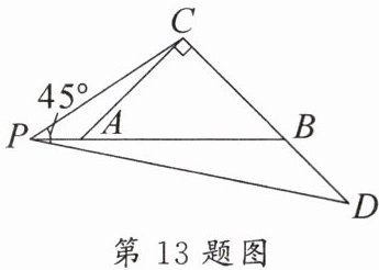 13. 如图, $ \triangle ABC $ 为等腰直角三角形, 点 $ P $ 在 $ BA $ 的延长线上, 点 $ D $ 在 $ CB $ 的延长线上, 连接 $ CP $, $ DP $, 且 $ \angle CPD = 45° $, $ AP = 1 $, $ AB = 4 $, 则 $ BD = $