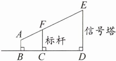 5. 如图,某测量工作人员头顶A与标杆顶点F、信号塔顶端E在同一直线上,已知此测量人员的头顶距地面的高AB为1.7m,标杆FC的长为3.4m,且测量人员与标杆的距离BC为3.5m,标杆与信号塔的距离CD为6.5m,AB⊥BD,FC⊥BD,ED⊥BD,求信号塔的高ED。(结果精确到0.1m)