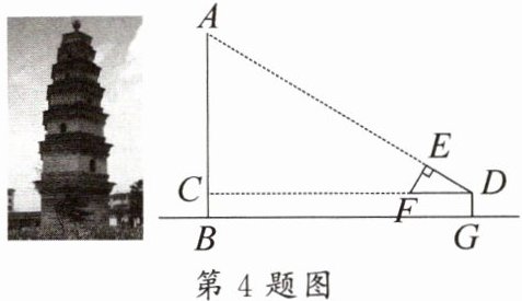 4. 如图,某校数学兴趣小组利用自制的直角三角形硬纸板DEF测量一座古塔的高度,他们通过调整测量位置,使斜边DF与地面保持平行,并使边DE与该古塔顶点A在同一直线上。已知DE= 1.6m,EF= 1.1m,测得点D与地面的距离DG= 1.3m,与古塔的水平距离DC= 40m,则该古塔AB的高度为
