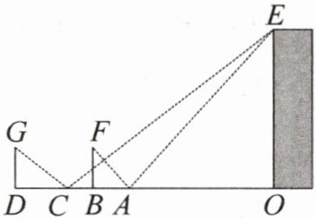 解:由题意,得$ \angle OAE=\angle BAF $,$ \angle OCE=\angle DCG $.$ \because \angle AOE=\angle ABF=90° $,$ \angle COE=\angle CDG=90° $,$ \therefore \triangle AOE \backsim \triangle ABF $,$ \triangle COE \backsim \triangle CDG $,$ \therefore \frac{OE}{BF}=\frac{AO}{AB} $,$ \frac{OE}{DG}=\frac{CO}{CD} $.$ \because BF=DG=1.6\ m $,$ \therefore \frac{AO}{AB}=\frac{CO}{CD}=\frac{OE}{1.6} $,$ \therefore \frac{CO-AO}{CD-AB}=\frac{OE}{1.6} $,即$ \frac{AC}{BD-AC}=\frac{OE}{1.6} $.$ \because AC=2\ m $,$ BD=2.1\ m $,$ \therefore \frac{2}{2.1-2}=\frac{OE}{1.6} $,$ \therefore OE=32\ m $.答:楼的高度 OE 为 32 m.