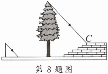8. 如图,社会实践小组的同学们想利用树影测量树高。课外活动时他们在阳光下测得一根长为1m的竹竿的影长是0.9m,同一时刻测量树高时,发现树的影子不全落在地面上,有一部分影子落在教学楼的台阶上,且影子的末端刚好落在最后一级台阶的上端C处。他们测得落在地面的影长为1.1m,台阶总高度为1.0m,台阶水平总宽度为1.6m,则树高为