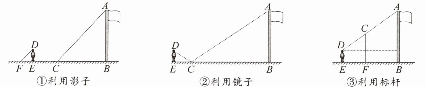 (1)如图①,小张在测量时发现,自己在操场上的影长 $ EF $ 恰好等于自己的身高 $ DE $.此时,小组同学测得旗杆 $ AB $ 的影长 $ BC $ 为 $ 11.3 $ m,据此可得旗杆高度为