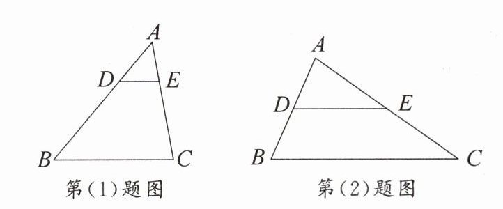 。(2)如图,在 $\triangle ABC$ 中,$D$,$E$ 分别是 $AB$,$AC$ 的中点。若 $\triangle ADE$ 的面积是 $3\mathrm{cm}^2$,则四边形 $BDEC$ 的面积为