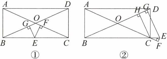 14. 如图①,在矩形$ABCD$中,$AB = 5$,$AD = 12$,对角线$AC与BD相交于点O$,$E为BC$边上的一个动点,$EF ⊥ AC$,$EG ⊥ BD$,垂足分别为$F$,$G$,则$EF + EG = $