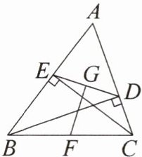 1. 如图,在$\triangle ABC$中,$BC = 18$,$BD \perp AC于点D$,$CE \perp AB于点E$,连接$DE$,$F$,$G分别为BC$,$DE$的中点。若$DE = 10$,则$FG$的长为