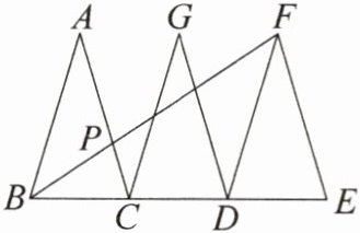 13. [2025·舞钢期末]如图,$\triangle ABC,\triangle GCD,\triangle FDE$是三个全等的等腰三角形,点$B,C,D,E$在一条直线上,且$AB = \sqrt{3}$,$BC = 1$,$BF交AC于点P$。