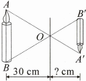 14. 新考向 跨物理·小孔成像 [2024·扬州中考]物理课上学过小孔成像的原理,它是一种利用光的直线传播特性实现图像投影的方法。如图,燃烧的蜡烛(竖直放置)$AB经小孔O$在屏幕(竖直放置)上成像$A'B'$。若$AB = 36cm$,$A'B' = 24cm$,小孔$O到AB的距离为30cm$,则小孔$O到A'B'$的距离为