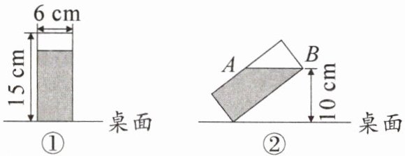 15. 新考向 情境题·容器截面图 [2025·郑州郑东新区期末]如图①是装了液体的长方体容器的截面图,将容器按图②所示方式倾斜后,水面恰好接触到容器口的边缘,则此时水面宽度$AB$为(