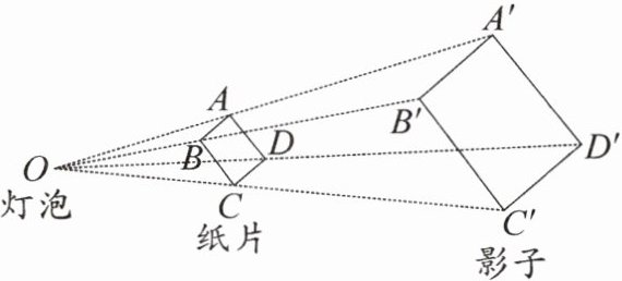 16. 如图,小明用灯泡$O照射一个矩形硬纸片ABCD$,在墙上形成矩形影子$A'B'C'D'$。现测得$OA = 10cm$,$OA' = 25cm$,纸片$ABCD的面积为16cm^2$,则影子$A'B'C'D'$的面积为