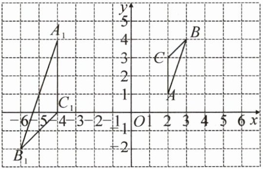 17. 如图,在平面直角坐标系中,已知$\triangle A_1B_1C_1与\triangle ABC$位似,$\triangle ABC的顶点坐标分别是A(2,1)$,$B(3,4)$,$C(2,3)$,$\triangle A_1B_1C_1的顶点坐标分别是A_1(-4,4)$,$B_1(-6,-2)$,$C_1(-4,0)$。