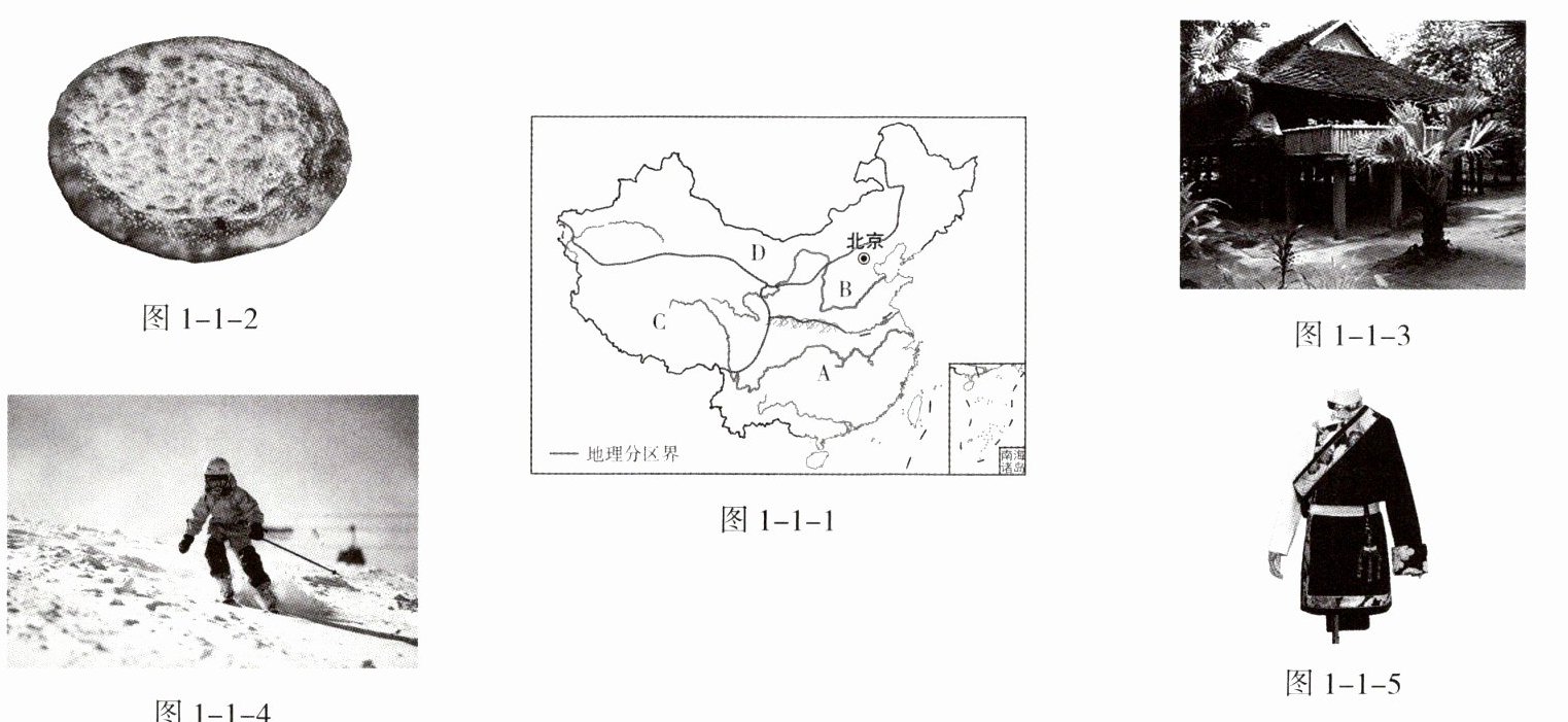 将图 1 - 1 - 2 至图 1 - 1 - 5 中显示的四种地理事物或现象,与图 1 - 1 - 1 中相对应的 ABCD 四个地区连线。