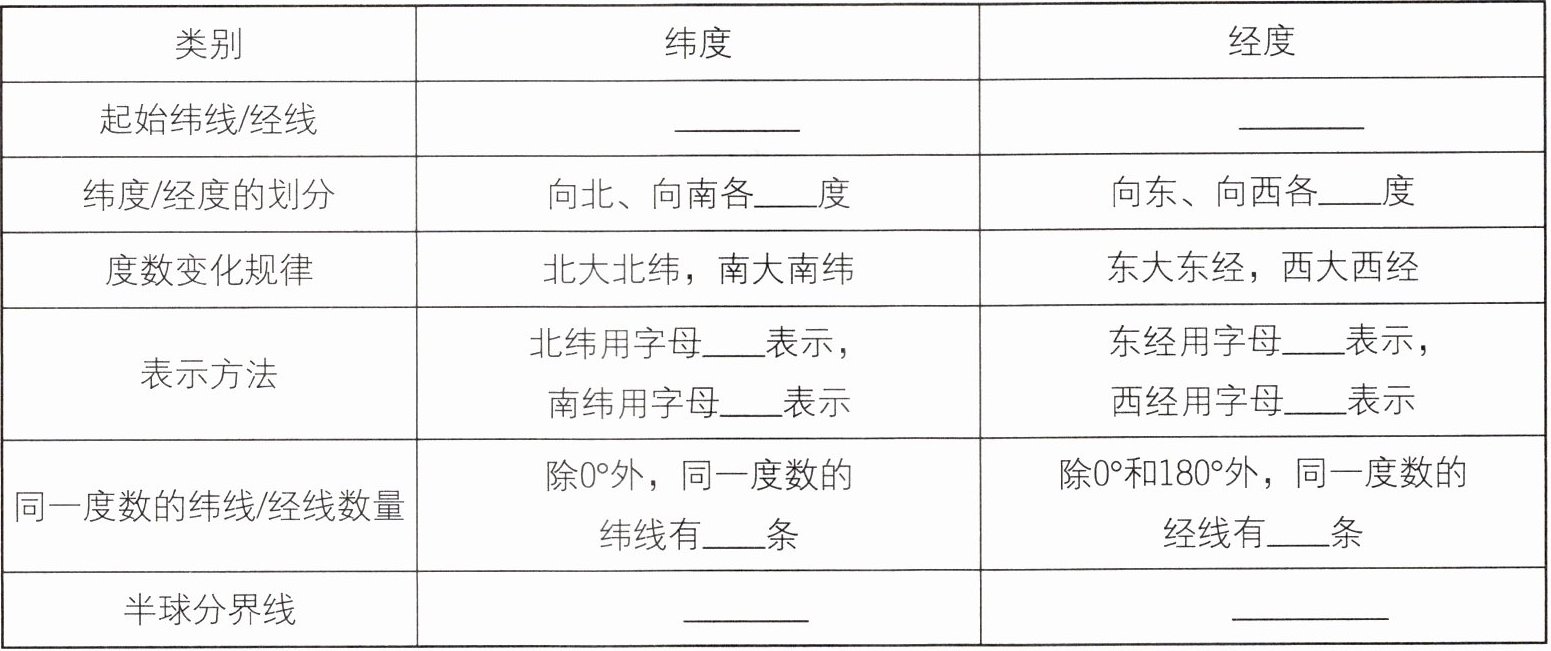 |同一度数的纬线/经线数量|除0°外,同一度数的纬线有______条|除0°和180°外,同一度数的经线有______条|