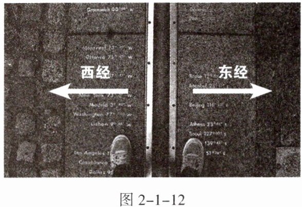 贝贝到英国旅游,特意来到格林尼治天文台旧址,站在本初子午线地面标志拍照留念(图2-1-12)。据此完成6~8题。