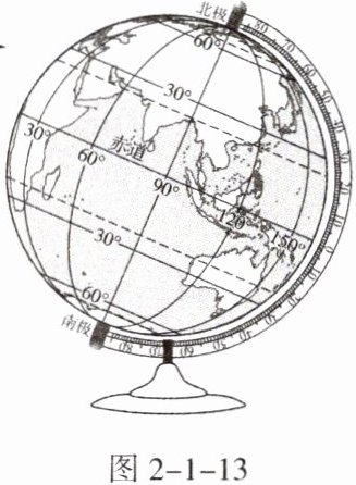 地球仪是地理学习的重要工具。为了学好地理,玲玲购买了地球仪并进行了研究。图2-1-13示意地球仪,据此完成9~10题。