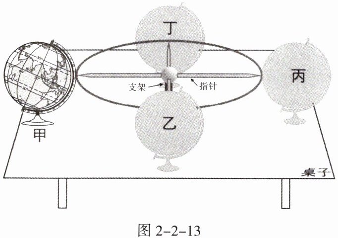 某同学利用地球仪做地球公转模拟实验(图 2 - 2 - 13)。桌面上摆放支架,支架上小球代表太阳,四个指针代表不同日期太阳在地球表面的直射光线,指针外圆环表示地球公转轨道。甲处示意地球仪演示地球公转的起始位置。据此完成 1~3 题。