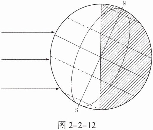 地球公转会导致同一地点昼夜长短的变化,也会导致地表昼夜分布情况的变化。图 2 - 2 - 12 示意某日地球昼夜分布。据此完成 13~15 题。