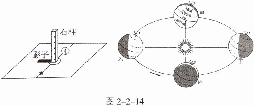 4. 河北某中学地理兴趣小组利用广场上的石柱进行地理实践活动。图 2 - 2 - 14 示意石柱正午影子和地球公转。读图,完成下列任务。