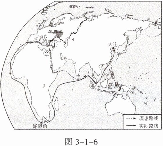 1. 强国必须强军,强军才能国安。2002年3月,我国自乌克兰购买的一艘未竣工的“瓦良格号”航空母舰,耗时4个月,行程2.8万千米,到达大连港口。2012年,基于“瓦良格号”改建的我国第一艘航空母舰“辽宁号”交付中国人民解放军海军。图3-1-6是“瓦良格号”航行示意图。据此完成下列任务。