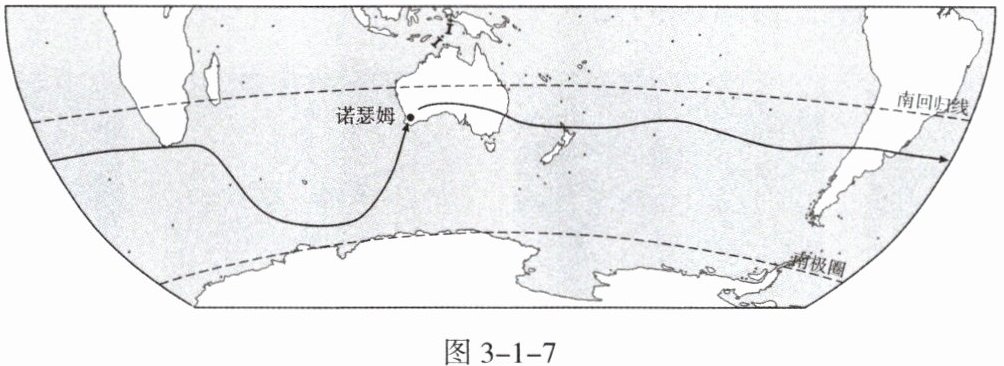 2. 环游地球是许多人的梦想。2016年7月,俄罗斯探险家费奥多尔独自一人搭乘热气球,从澳大利亚西部的诺瑟姆起飞向东,环球一周后顺利返回澳大利亚的出发地。途中,由于遭遇雷暴天气,费奥多尔被迫改变航线躲避。图3-1-7示意费奥多尔环球飞行线路。据此完成下列任务。