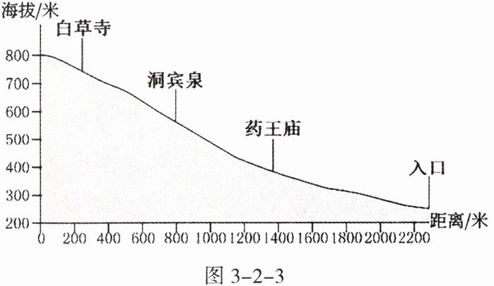 封龙山是一座历史文化名山,这里既有浑然天成的自然景观,又有十分丰富的历史资源,在我国文化史、科学发展史上占有重要地位。图 3 - 2 - 3 示意封龙山部分景观海拔。据此完成 1~2 题。