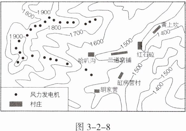 风能属于清洁能源,我国正大力开发风能。图 3 - 2 - 8 示意我国某地风力发电机(俗称“大风车”)分布。据此完成 13~14 题。