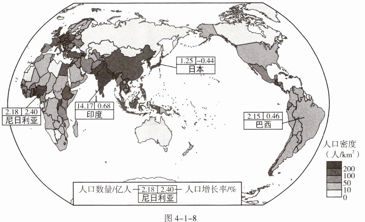 1. 世界人口的增长速度,不仅随着社会的发展而变化,而且有明显的地区差异。图4-1-8为世界各国和地区人口密度及2022年四个国家人口数量和人口增长率分布图。据此完成下列问题。