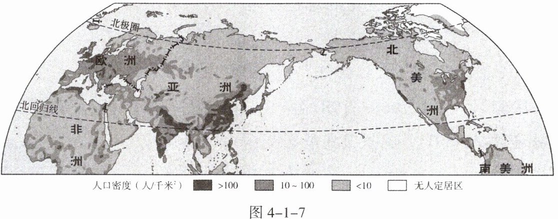 北半球陆地约占全球陆地面积的66.6%,而人口占比90%,是世界上人类活动最活跃的地区。图4-1-7示意北半球人口的分布。据此完成8~10题。