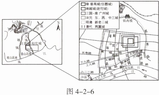 汉高祖元年(公元前 206 年),赵佗建立南越国,将秦代番禺城扩建,形成赵佗城。随着时代变迁,这里成为我国人口超千万的超大城市广州。图 4-2-6 示意赵佗城古城址位置和赵佗城历代的演变。据此完成 7~9 题。