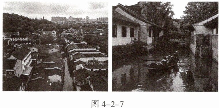 “山阴道上行,如在镜中游。”王羲之诗句中的浙江绍兴山明水秀、钟灵毓秀。图 4-2-7 是绍兴景观照片。据此完成 10~11 题。