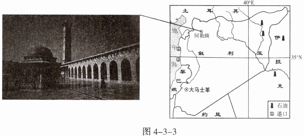 叙利亚是世界古老文明的发源地之一,有许多文物古迹被列入联合国世界文化遗产名录。然而随着战火蔓延,许多建筑被毁。图 4-3-3 示意叙利亚阿勒颇大清真寺位置和战前景观。据此完成 5~7 题。