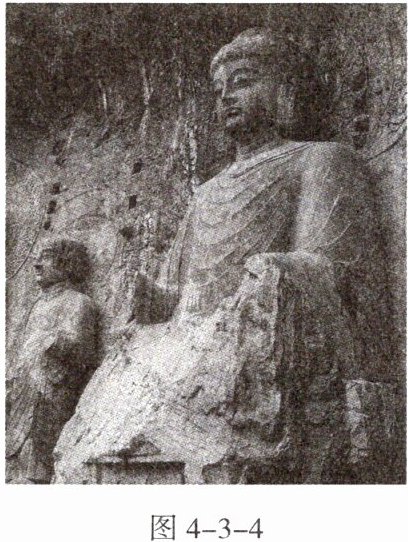 河南龙门石窟开凿于北魏年间,连续大规模营造达 400 余年之久,是世界文化遗产之一。图 4-3-4 示意龙门石窟卢舍那大佛景观。据此完成 10~12 题。