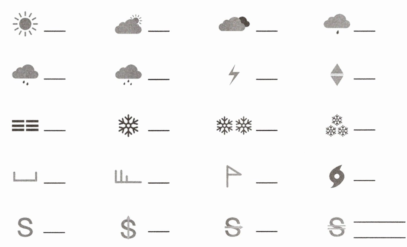 (从左到右,从上到下)晴、多云、阴天、小雨、中雨、大雨、雷电、冰雹、雾、小雪、中雪、大雪、霜冻、风(西风5级)、风(北风8级)、台风、浮尘、扬尘、沙尘暴、强沙尘暴和特强沙尘暴。