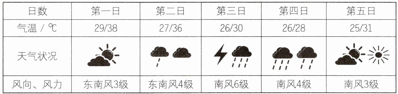 某中学地理兴趣小组查询天气并制作了某城市未来五天天气情况记录表。据此完成5~7题。