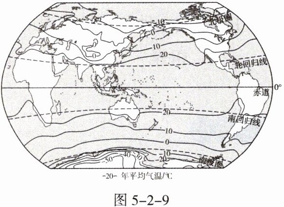 新能源汽车越来越受到大众的喜爱,但锂电池受温度的影响很大,最佳工作温度为 $20\sim30^{\circ}C$,当温度低于 $0^{\circ}C$ 时,其续航里程会明显下降。图5-2-9示意世界年平均气温分布。据此完成8~10题。