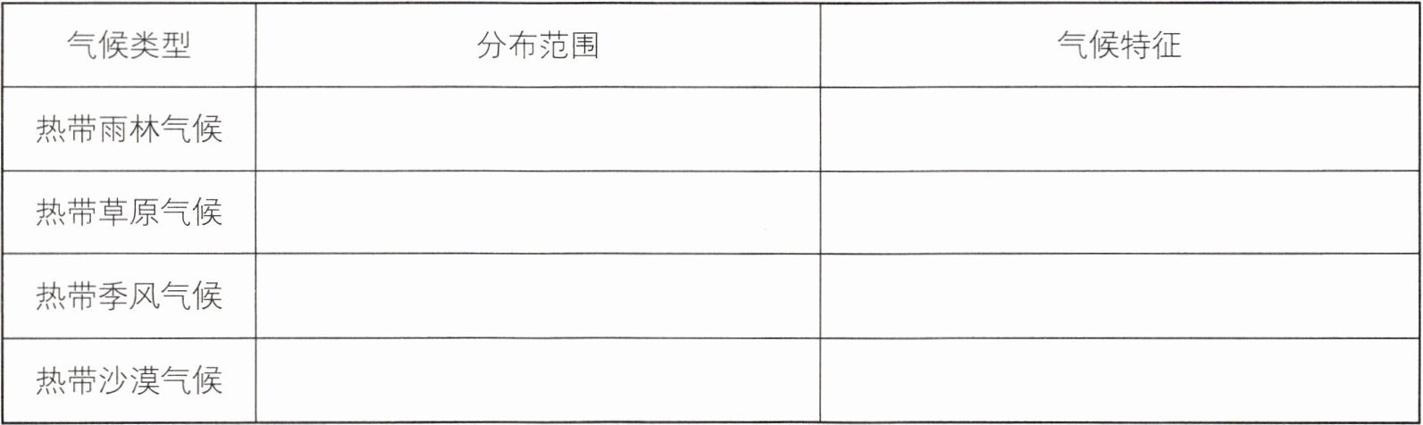 (第一列)赤道附近,如亚马孙平原、刚果盆地和马来群岛等地;热带雨林气候的南北两侧;印度半岛和中南半岛;南北回归线经过的内陆和大路西岸地区。(第二列)全年高温多雨,气温年较差小;终年高温,降水年内分布不均匀;气温终年较高,长夏无冬,旱、雨季明显;全年炎热干燥,降水极少。