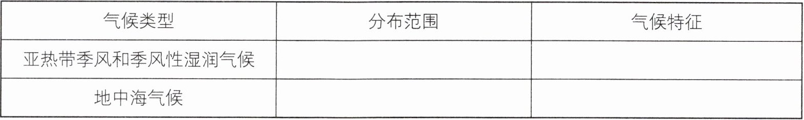 (第一列)亚热带的大陆东岸地区;南北纬30°—40°的大陆西岸。(第二列)四季分明,夏季高温多;夏季炎热干燥,冬季温和多雨。