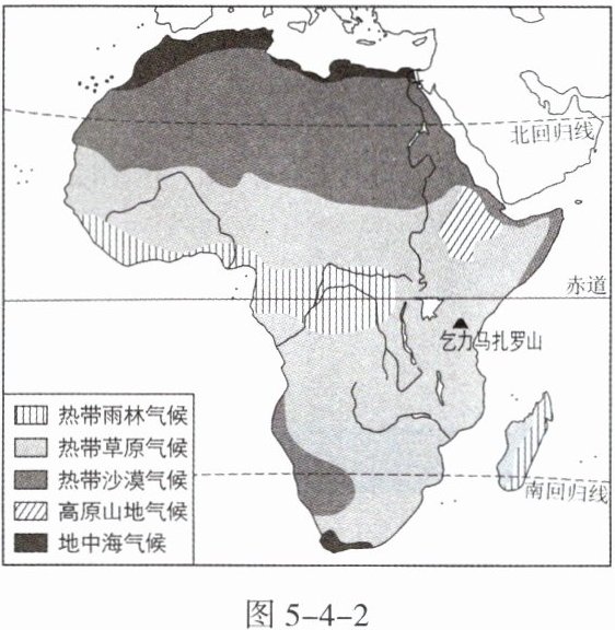 非洲 3/4 的面积在南、北回归线之间,绝大部分地区年平均气温在 20℃以上,气候普遍炎热,因而被称为“热带大陆”。图 5-4-2 示意非洲气候类型。据此完成 1~3 题。