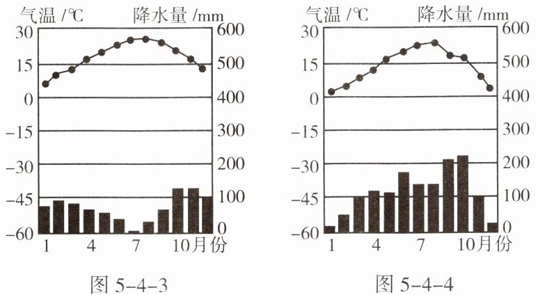 亚热带是世界上一个重要的气候带,不在五带之列。图 5-4-3 示意地中海气候,图 5-4-4 示意亚热带季风和季风性湿润气候。据此完成 4~6 题。