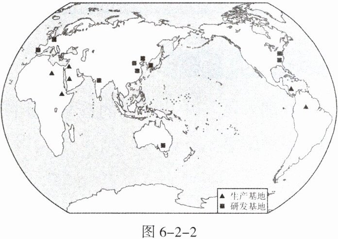 跨国公司在全球布局合适的产业基地,其中研发基地负责新产品的开发,生产基地负责生产零件与组装。图 6 - 2 - 2 为某跨国家电制造公司的生产、研发基地分布。据此完成 1~3 题。