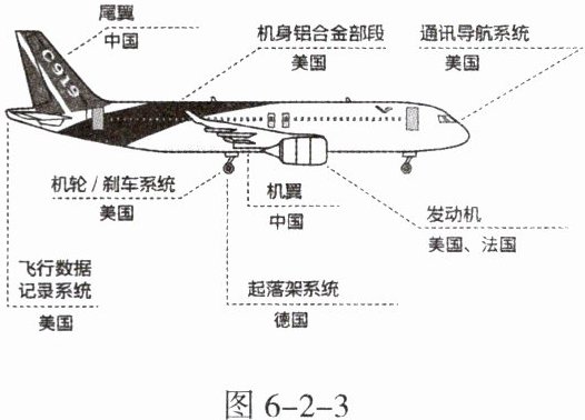 2023 年 5 月 28 日,由我国自主设计生产的大型客机 C919 完成首次商业飞行,该飞机部分部件由外国生产。图 6 - 2 - 3 为 C919 客机主要部件及其生产国示意图。据此完成 4~6 题。