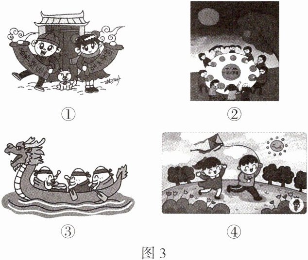 中国传统节日是中华民族悠久历史文化的重要组成部分,承载着天文、地理、历法等丰富的内容。图3示意我国四大传统节日。据此完成7~8题。