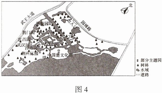 荆州园博园是集迎宾、博览、游赏、休闲为一体的园林盛景,是湖北省第二届园林博览会的举办地。园区位于湖北省第三大湖泊——长湖湖畔,楚故都纪南城国家级大遗址保护区的东侧,历史文化底蕴深厚,自然生态风光旖旎。图4为荆州市园博园简图。据此完成18~20题。
